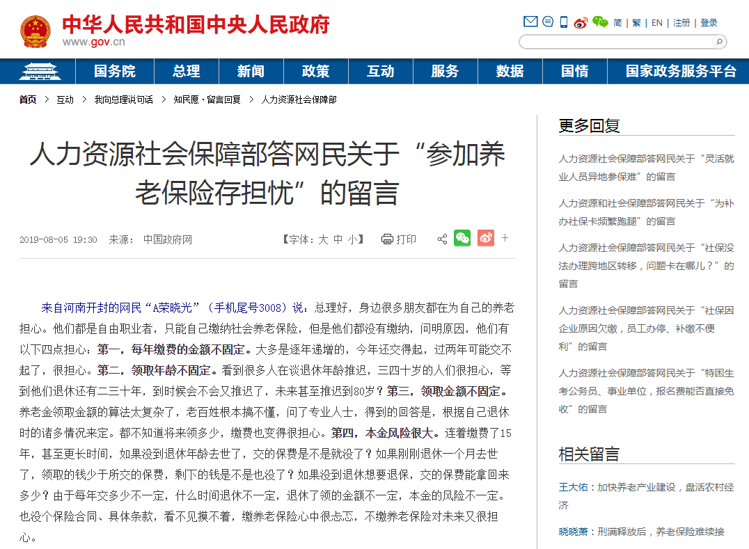 2019年8月5日,人力資源社會(huì)保障部在答中國(guó)政府網(wǎng)網(wǎng)民關(guān)于“參加養(yǎng)老保險(xiǎn)存擔(dān)憂”的留言中表示: