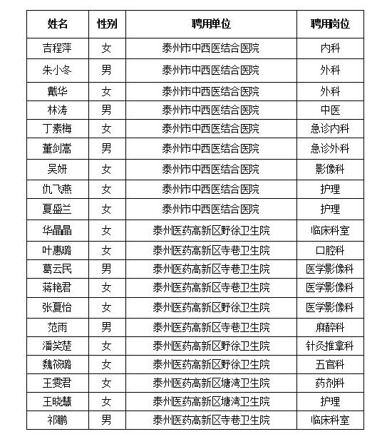 2019泰州醫(yī)藥高新區(qū)醫(yī)療衛(wèi)生事業(yè)單位招聘擬聘公示