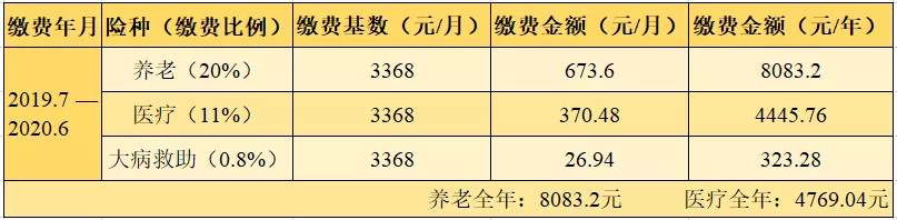 三、2019.7—2020.6年度最低繳費標(biāo)準(zhǔn)(繳費金額=繳費基數(shù)×繳費比例)