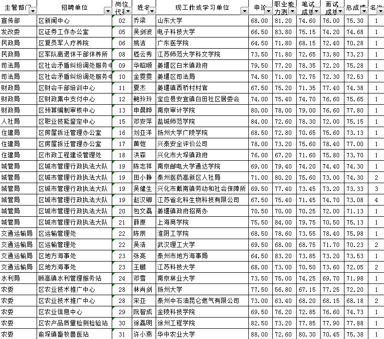 泰州人才網(wǎng)訊:根據(jù)《姜堰區(qū)2013年事業(yè)單位公開(kāi)招聘人員簡(jiǎn)章》規(guī)定,經(jīng)報(bào)名、筆試、面試、體檢、考察等程序,喬梁等73同志(名單附后)符合相應(yīng)事業(yè)單位聘用條件。現(xiàn)向社會(huì)公示,如發(fā)現(xiàn)公示對(duì)象有不符合招聘條件的,可以通過(guò)來(lái)信、來(lái)電、來(lái)訪等形式向區(qū)紀(jì)委、區(qū)委組織部、區(qū)人社局反映(聯(lián)系電話:88869216、88869186、88869415)。公示時(shí)間為201…