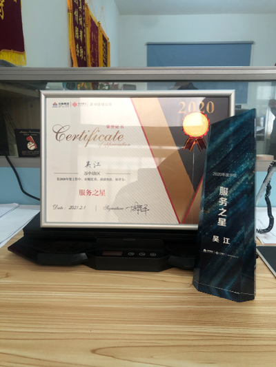 2020年度評(píng)先評(píng)優(yōu),獲得戰(zhàn)區(qū)服務(wù)之星獎(jiǎng);集團(tuán)賽維滿意度,2020年度個(gè)人滿意度服務(wù)平均分?jǐn)?shù)91分,
